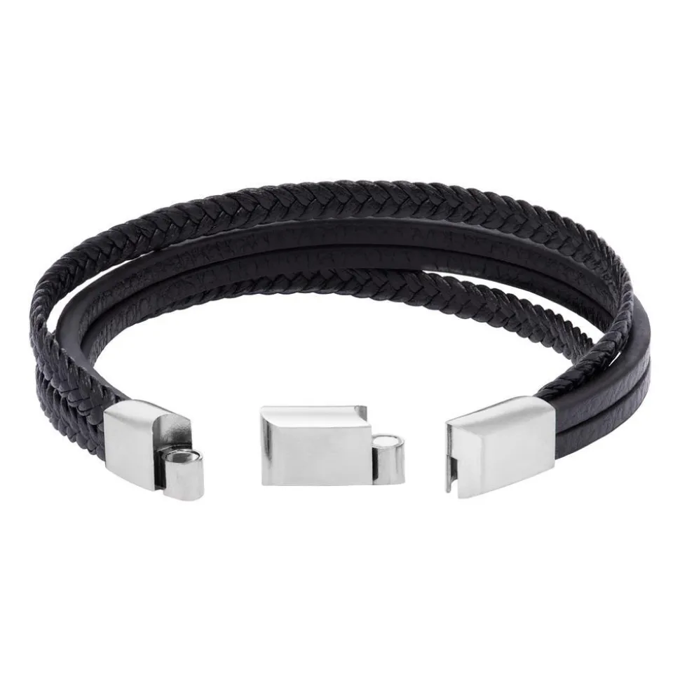 Dieses Armband begeistert mit seiner unaufgeregten Lässigkeit. Es besteht aus zwei geflochtenen Kunstledersträngen und zwei Bändern aus schwarzem Kunstleder. Der Verschluss aus Edelstahl mit Magneten kann mit einer Wunschgravur versehen werden – perfekt für Initialen. Im Lieferumfang ist ein Zwischenelement enthalten, welches in den Verschluss eingesetzt werden kann, um das Armband zu erweitern.