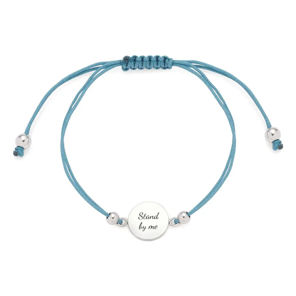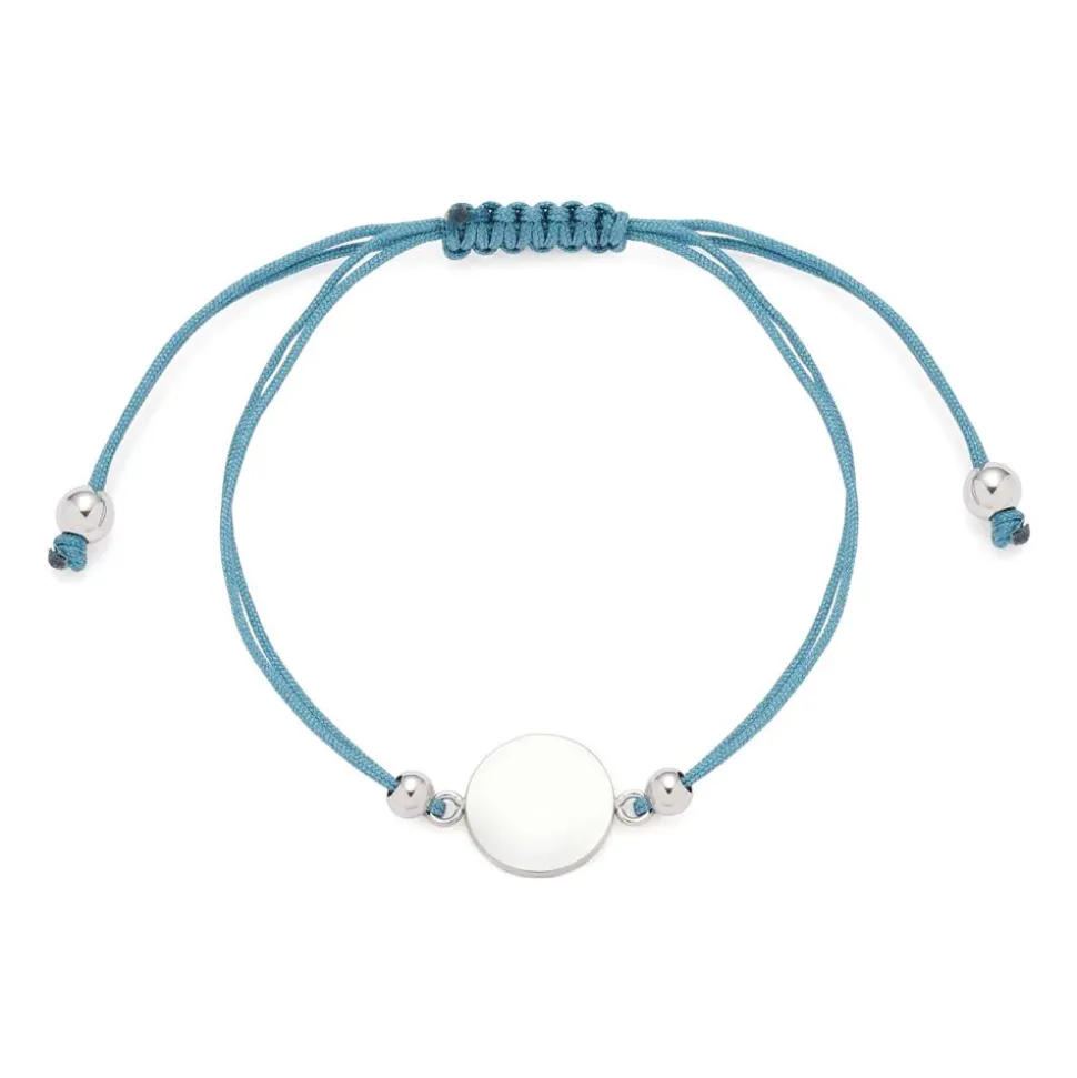 Dieses Damenarmband besteht aus einem zweireihigen geknüpften Textilband in Petrol und trägt ein rundes Plättchen und Schmuckperlen aus Edelstahl. Das Plättchen kann auf beiden Seiten mit einer persönlichen Botschaft graviert werden. Der praktische Zugverschluss des Armbands ermöglicht eine individuelle Anpassung der Weite.