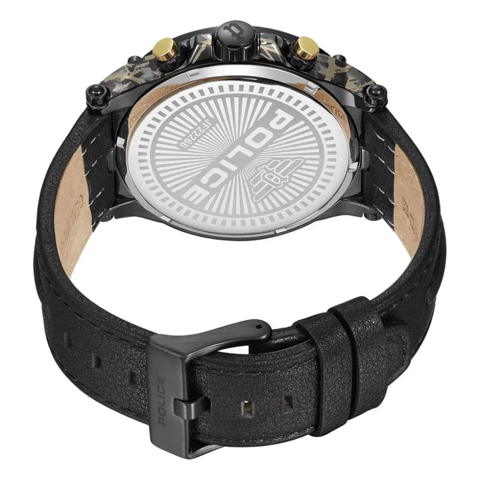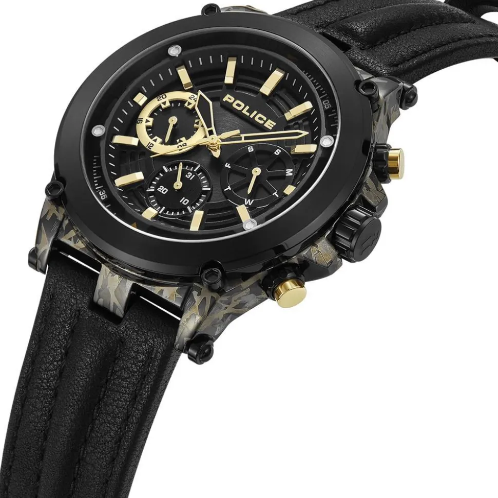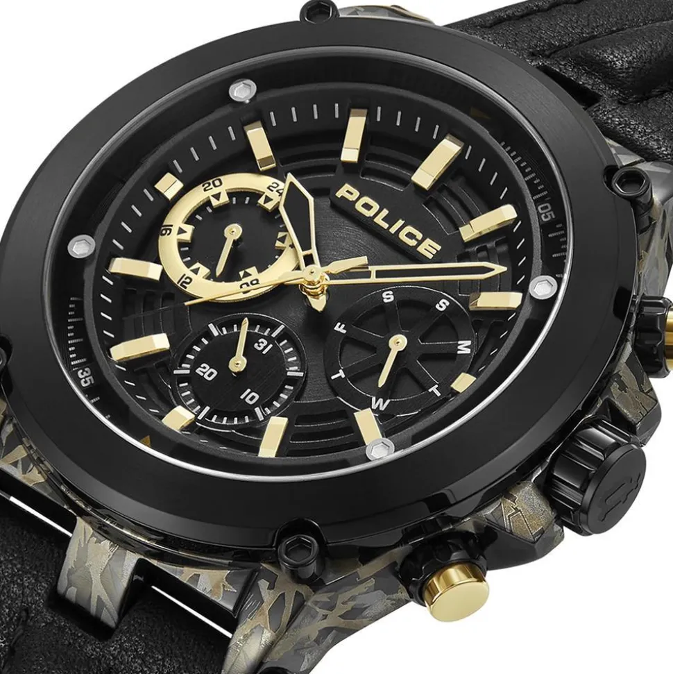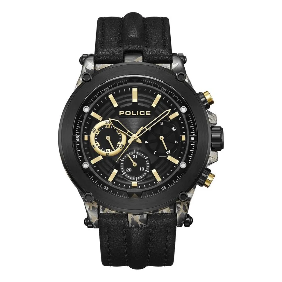 Diese Quarzuhr für Herren besitzt ein absolut cooles Design. Ihr Edelstahlgehäuse ist mit einer schwarz-goldenen Ionenplattierung versehen und wird von einem schwarzen Lederarmband mit Dornschließe gehalten. Auf dem schwarzen Zifferblatt im Industrial Design befindet sich eine Datums-, Wochentags- und 24-Stundenanzeige. Goldfarbene Details auf dem Zifferblatt und den Kronen verleihen der Uhr einen edlen Touch. Sie ist bis zu einem Druck von 5 bar wasserfest.