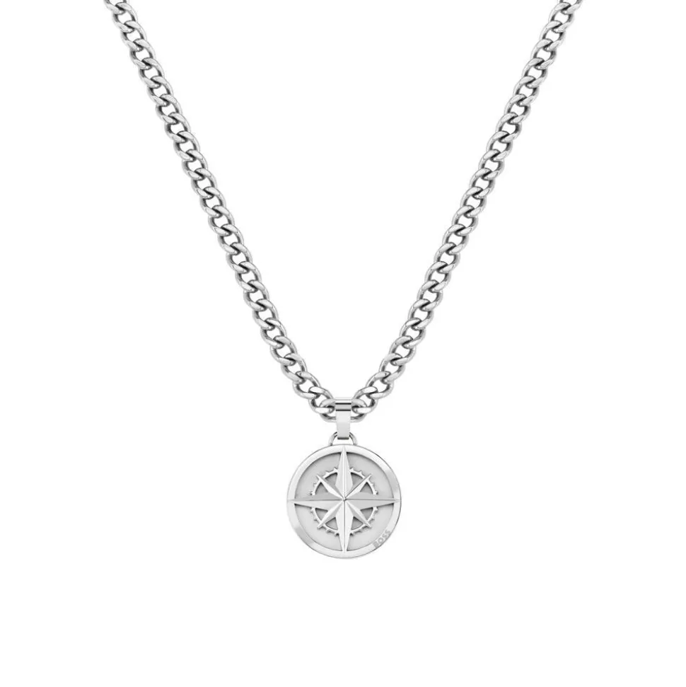 Ein moderner Begleiter für den Alltag – das ist diese Halskette für Herren. Sie besteht aus Edelstahl und besitzt eine Panzerkettengliederung sowie einen runden Anhänger. Der Anhänger trägt auf der Vorderseite eine Windrose. Ein Karabinerverschluss schließt die Kette.