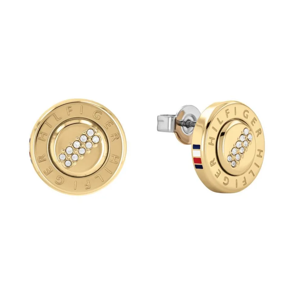 Diese Damenohrstecker verleihen jedem Outfit einen eleganten Touch. Sie sind aus Edelstahl gefertigt und besitzen eine Ionenplattierung aus Gold. In der Mitte werden die Ohrstecker von jeweils zehn funkelnden Glassteinen geziert. Das typische Markenlogo in blauer, weißer und roter Farbe ist an der Seite der Ohrstecker zu sehen.