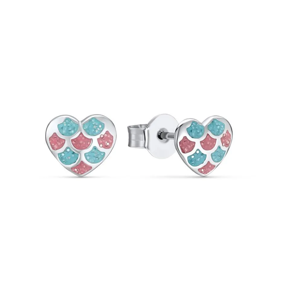 Diese Herzohrstecker sind die perfekten Accessoires für kleine Wassernixen! Sie bestehen aus Sterlingsilber, welches rhodiniert und somit anlaufgeschützt ist. Jedes der Herzen wird von rosafarben- und türkis-glitzernder Emaille geziert, die an die Schuppen der Flosse einer Meerjungfrau erinnern.