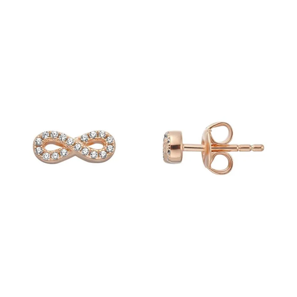 Diese Ohrstecker für Damen in Form des Unendlichkeitszeichens sind absolut modern. Die Ohrstecker bestehen aus rosévergoldetem 925er Silber und werden auf der Vorderseite von Zirkoniasteinen geziert.