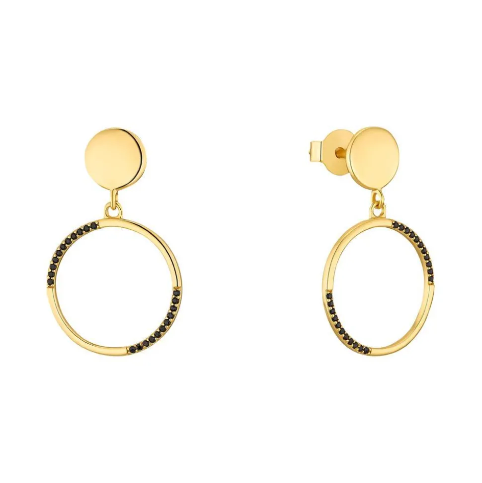 Überaus stilvoll – das sind diese Ohrstecker für Damen. Sie sind aus Sterlingsilber gefertigt und mit einer goldfarbenen IP-Beschichtung versehen. Die Ohrstecker besitzen jeweils einen Kreisanhänger, der zum Teil mit Zirkoniasteinen in schwarzer Farbe besetzt ist.