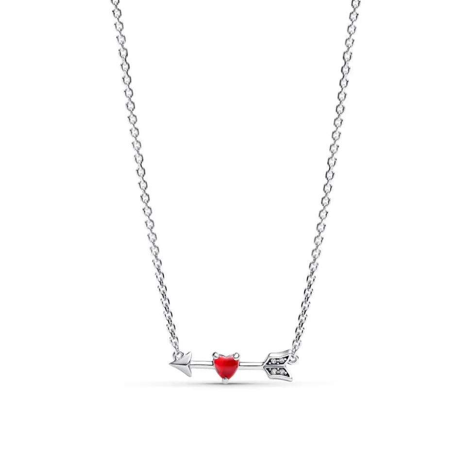 Ein umwerfender Eyecatcher – das ist diese Damenkette aus recyceltem Sterlingsilber. Sie verfügt über ein eingearbeitetes Schmuckelement, das einen Pfeil darstellt. Dieser ist am Ende mit funkelnden Zirkonia besetzt und weist in der Mitte ein Herz aus rotem Glas auf. Durch die Zwischenösen kann die Kette in der Länge verstellt werden. Zudem wird sie mit einem Karabiner verschlossen.