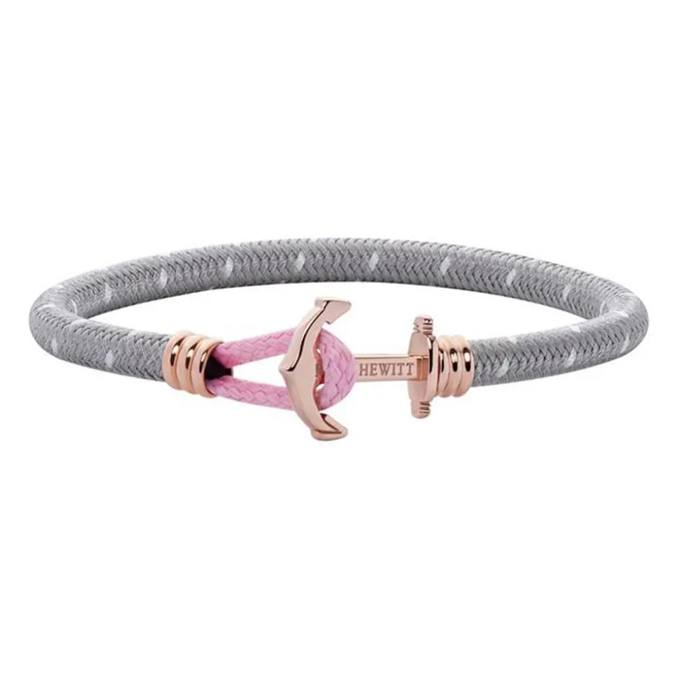 Dieses Damenarmband begeistert mit seinem maritimen Design! Es besteht aus robustem Nylon in Grau und Weiß. Die Schlaufe für den Ankerverschluss aus rosévergoldetem Edelstahl ist rosafarben.