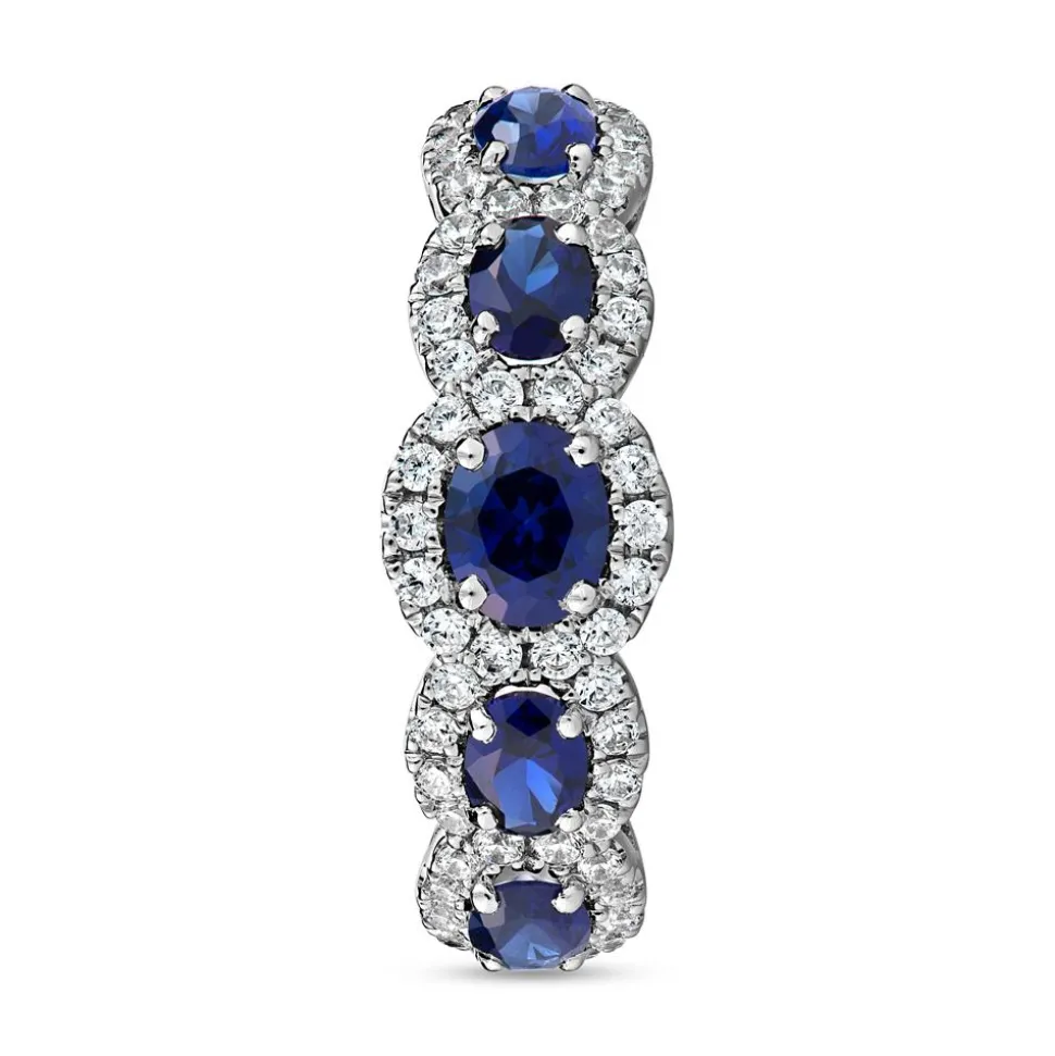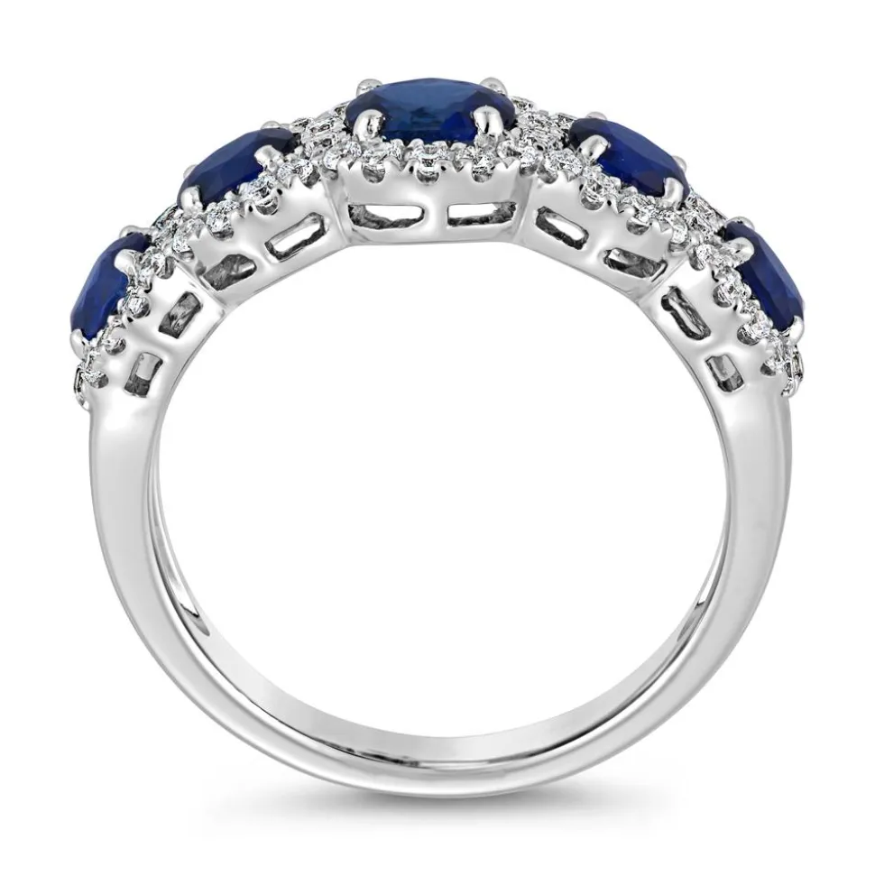 Klassische Eleganz – damit besticht dieser Ring! Er ist wahlweise aus 585er oder 750er Weißgold oder 950er Platin gefertigt. Bitte die bevorzugte Legierung im Drop-down-Feld auswählen. Besonderer Blickfang sind die 5 Saphire (gesamt ca. 1,65 ct.), wovon der mittlere Stein der größte ist. Um die Saphire befindet sich ein Rahmen aus Diamanten im Brillantschliff (insgesamt: 50; zusammen ca. 0,39 ct.; G/SI). Neben höchsten Qualitätsstandards achten wir auch auf ethische Aspekte. Deshalb stammen unsere Diamanten ausschließlich aus konfliktfreien Quellen. Der Ring kann auf der Innenseite individuell graviert werden.
