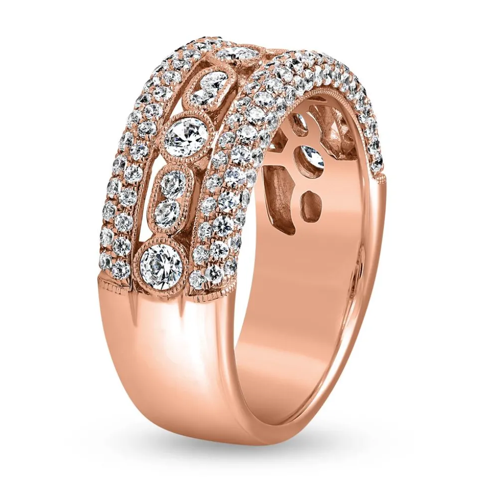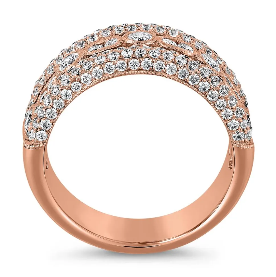 Umwerfend – das ist dieser Damenring aus wahlweise 585er oder 750er Roségold. Über das Drop-down-Feld kann die gewünschte Legierung einfach ausgewählt werden. Die obere Hälfte der Ringschiene ist durchbrochen und mit insgesamt 151 verschieden großen lab-grown Diamanten besetzt, die zusammen über ca. 1,19 ct. verfügen und einen Brillantschliff aufweisen. Zudem fallen die lab-grown Diamanten unter die Farbe River – Top Wesselton und die Reinheit VVS-VS. Die Steine in der Mitte der Ringschiene sind in ovale und runde Fassungen eingearbeitet, die über eine Millgriff-Perlierung verfügen. Die Ränder sind mit in Reihen angeordneten laborgezüchteten Diamanten verziert. Die lab-grown Diamanten stehen natürlichen in nichts nach und besitzen dieselben Eigenschaften sowie dasselbe Funkeln. Auf Wunsch kann die Innenseite des Rings mit einer persönlichen Gravur versehen werden.