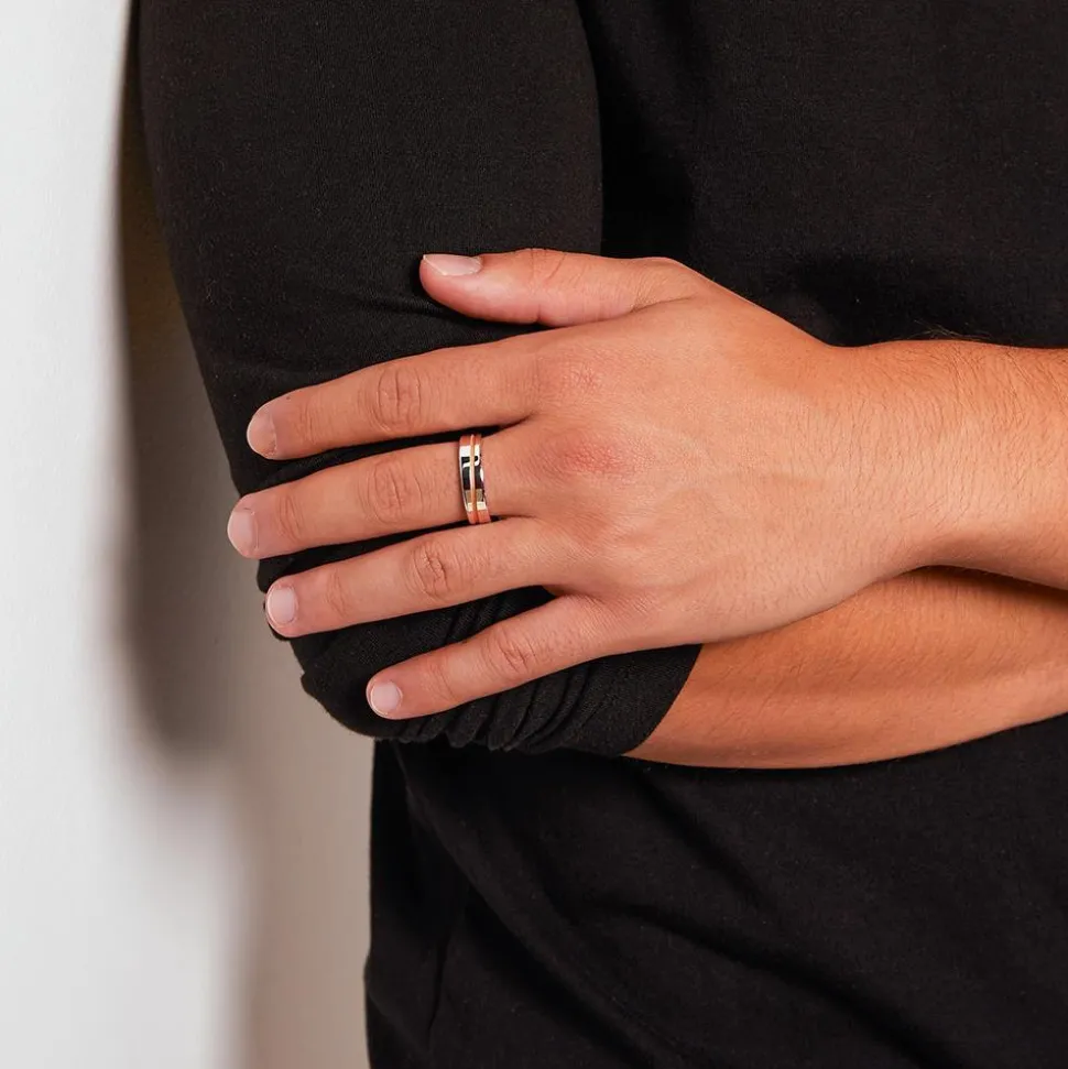 Zeitlos und modern zugleich – das ist dieser Herrenring aus Sterlingsilber. Er besitzt als optisches Highlight einen geschwungenen und mattierten Streifen in angesagtem Rosé. Zudem kann die Innenseite des Ringes mit einer persönlichen Gravur versehen werden. Durch die Rhodinierung ist der Ring anlaufgeschützt.
