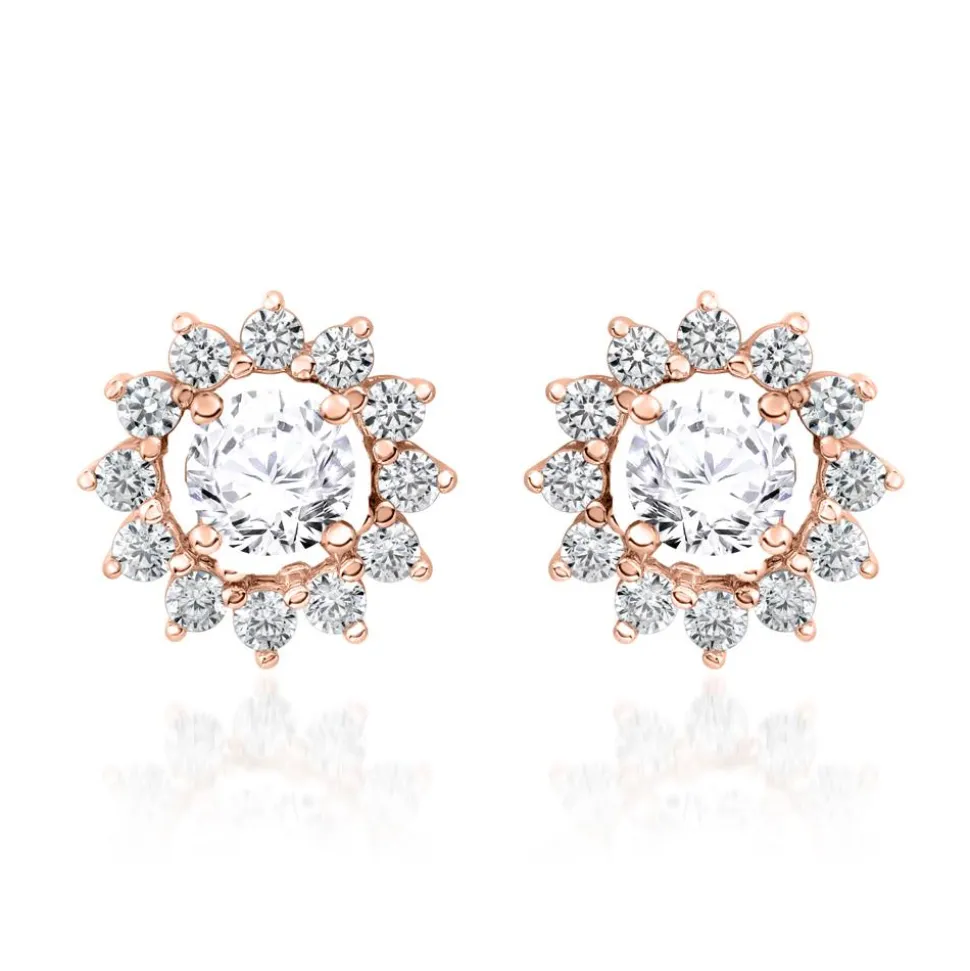 Diese Ohrstecker für Damen begeistern mit einem raffinierten Design. Sie bestehen entweder aus 14-karätigem oder aus 18-karätigem Roségold. Die Auswahl der gewünschten Legierung kann über das Drop-down-Feld getroffen werden. Die Ohrstecker begeistern mit ihrem Blüten-Design, welches durch jeweils einen Diamanten in der Mitte und 12 äußeren Diamanten entsteht. Der Diamant in der Mitte besitzt jeweils ca. 0,30 ct., während die weiteren Diamanten zusammen etwa 0,21 ct. pro Stecker aufweisen. Der Hauptdiamant befindet sich in einer 4-Krappenfassung. Die 12 kleineren Diamanten werden von jeweils drei Krappen gehalten und befinden sich nebeneinander platziert auf einem herausnehmbaren Rahmen, der den Hauptstein umgibt. Die Farbe der Brillanten ist als „Top Wesselton“ klassifiziert und ihre Reinheit gehört zur Kategorie „small inclusions“. Wir legen großen Wert auf hohe Qualitätsstandards und ethische Aspekte unseres Diamantschmucks. Deshalb stammen unsere Diamanten ausschließlich aus konfliktfreien Quellen. Die beiden Hauptsteine besitzen ein Zertifikat von dem renommierten Gemological Institute of America (GIA), welches mitgeliefert wird.