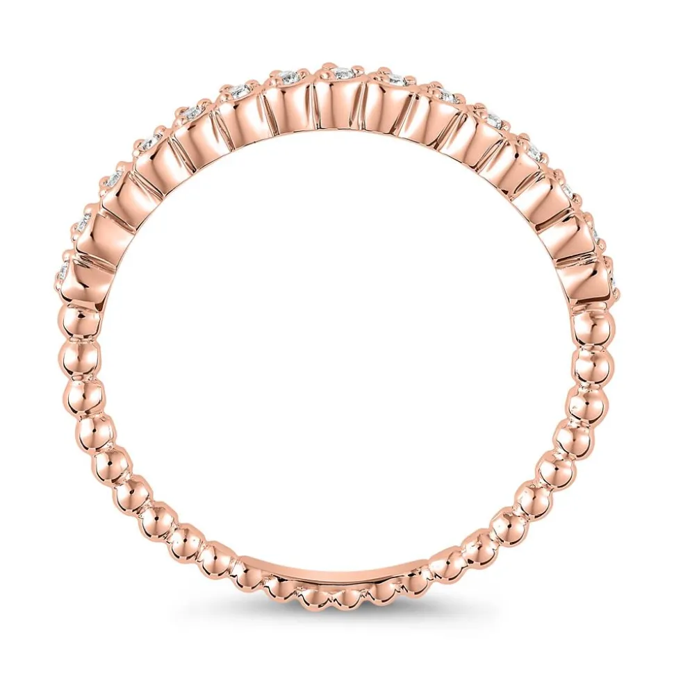 Ein stilvoller Damenring in zartem Roségold, der durch ein bezauberndes Erscheinungsbild überzeugt. Die vordere Hälfte der Ringschiene ist mit herzförmigen Fassungen versehen, die jeweils einen Diamanten im Brillantschliff tragen. Die Rückseite des Rings verjüngt sich zu einer schmalen Kugelstruktur. Insgesamt sind 15 Diamanten (ca. 0,10 ct. gesamt) in die Ringschiene eingefasst. Die Farbe der Diamanten ist als TW (Top Wesselton) klassifiziert und ihre Reinheit gehört zur Kategorie SI (small inclusions). Weiterhin zeichnen sich alle Brillanten durch eine konfliktfreie Herkunft aus. Da der Ring sowohl in 14- als auch in 18-karätigem Roségold zur Verfügung steht, lässt sich die gewünschte Legierung ganz einfach über das Drop-down-Menü auswählen.