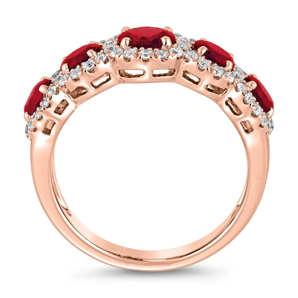 Dieser Ring begeistert mit seinem harmonischen Farbspiel aus Roségold und dem tiefen Rot des Steinbesatzes. Beim Material kann im Drop-down-Feld ausgewählt werden, ob er in 585er (14 Karat) oder 750er (18 Karat) Roségold geliefert werden soll. Besonderer Blickfang sind die 5 Rubine (gesamt ca. 1,65 ct.), wovon der mittlere Stein der größte ist. Um diese befindet sich ein Rahmen aus Diamanten im Brillantschliff (insgesamt: 50; zusammen ca. 0,39 ct.; G/SI). Für uns ist es selbstverständlich, dass sie ausschließlich aus konfliktfreien Quellen stammen. Innen kann der Ring mit einer individuellen Gravur versehen werden.