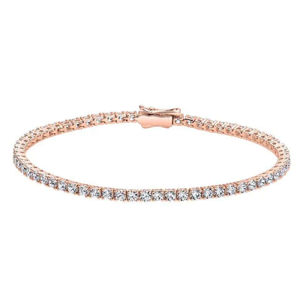 Ein bemerkenswerter Blickfang – das ist dieses bezaubernde Rivière-Armband aus edlem Roségold (585er oder 750er). Über das praktische Drop-down-Feld ist die Legierung des Armbands frei wählbar. Die Armkette verfügt über 64 Diamanten (ca. 4,00 ct. gesamt), die sich in Chatonfassungen befinden und sich durch eine hohe Qualität (Farbe TW, Reinheit SI) auszeichnen. Da uns unsere ethische Verantwortung wichtig ist, beziehen wir ausschließlich konfliktfreie Diamanten. Der Clipverschluss mit integriertem Sicherheitsbügel fügt sich perfekt in das Armband ein und sorgt für einen sicheren Halt.
