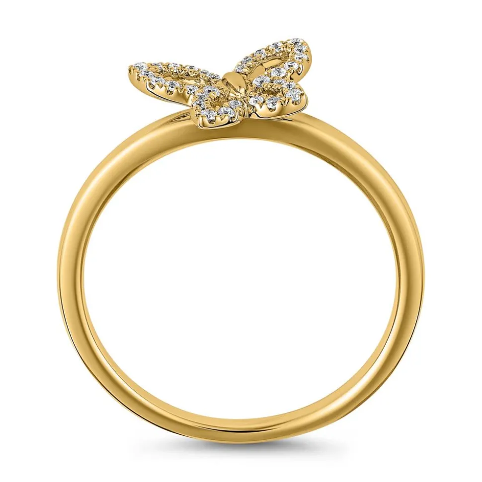 Ein eleganter Damenring, der mit einem traumhaften Schmetterling bezaubert. Gefertigt aus edlem Gelbgold, kann die Legierung über das Drop-down-Feld frei ausgewählt werden (585er/750er). Der Schmetterling ist mit 32 Brillanten versehen, die ihn in ein funkelndes Highlight verwandeln. Die Diamanten haben ein Gesamtgewicht von ca. 0,10 ct., gehören zur Farbklasse „Top Wesselton“ und zur Reinheitskategorie „small inclusions“. Alle Steine stammen aus konfliktfreien Quellen. Eine individuelle Gravur auf der Innenseite der Ringschiene verleiht dem Ring eine persönliche Note.