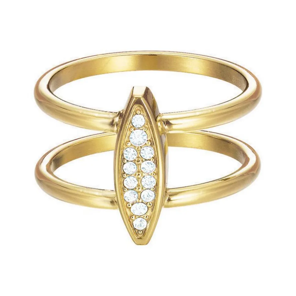 Der vergoldete Ring ES-Exclusive von Esprit ist ein eindeutiges Statement für Extravaganz. Zwei schlichte Ringschienen werden von einem länglichen Element mit funkelnden Schmucksteinen gekrönt. Der Ring besteht aus kratzfestem Edelstahl und ist auf Hochglanz poliert.