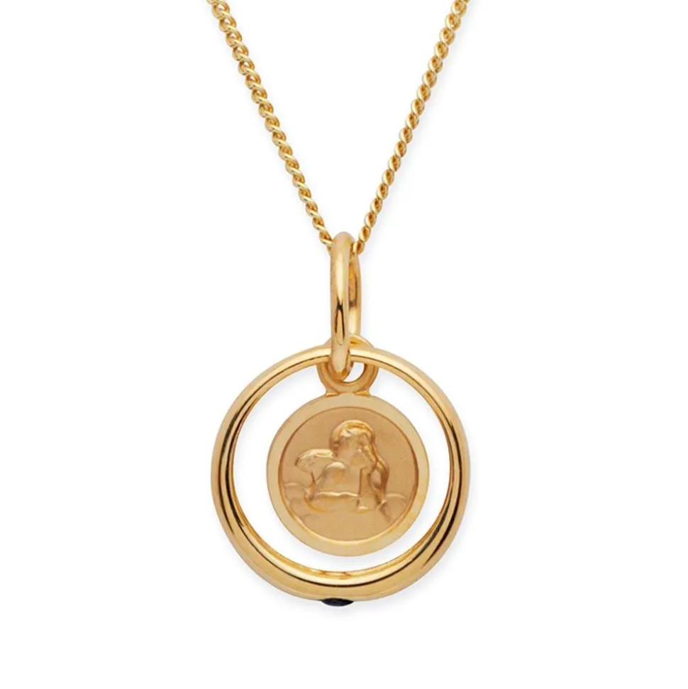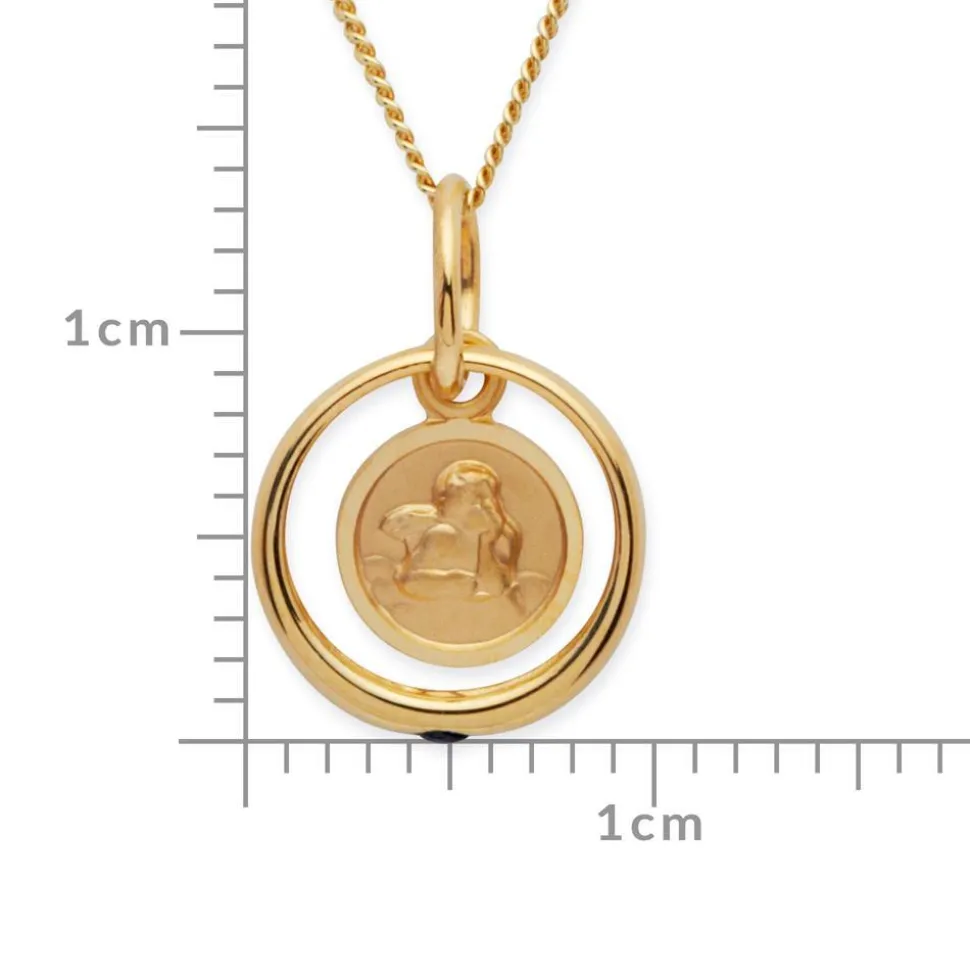 Ein Taufgeschenk mit Symbolwert – das ist diese Kette aus 8-karätigem Gold. Die Panzerkette trägt einen runden Anhänger mit Engelmotiv, der einen Taufring hält. Der Ring wird von einem Saphir geziert.