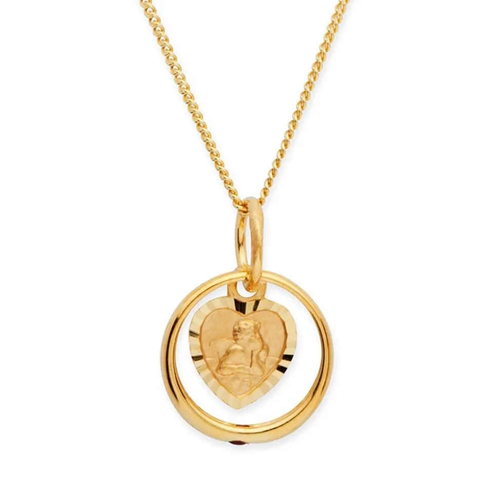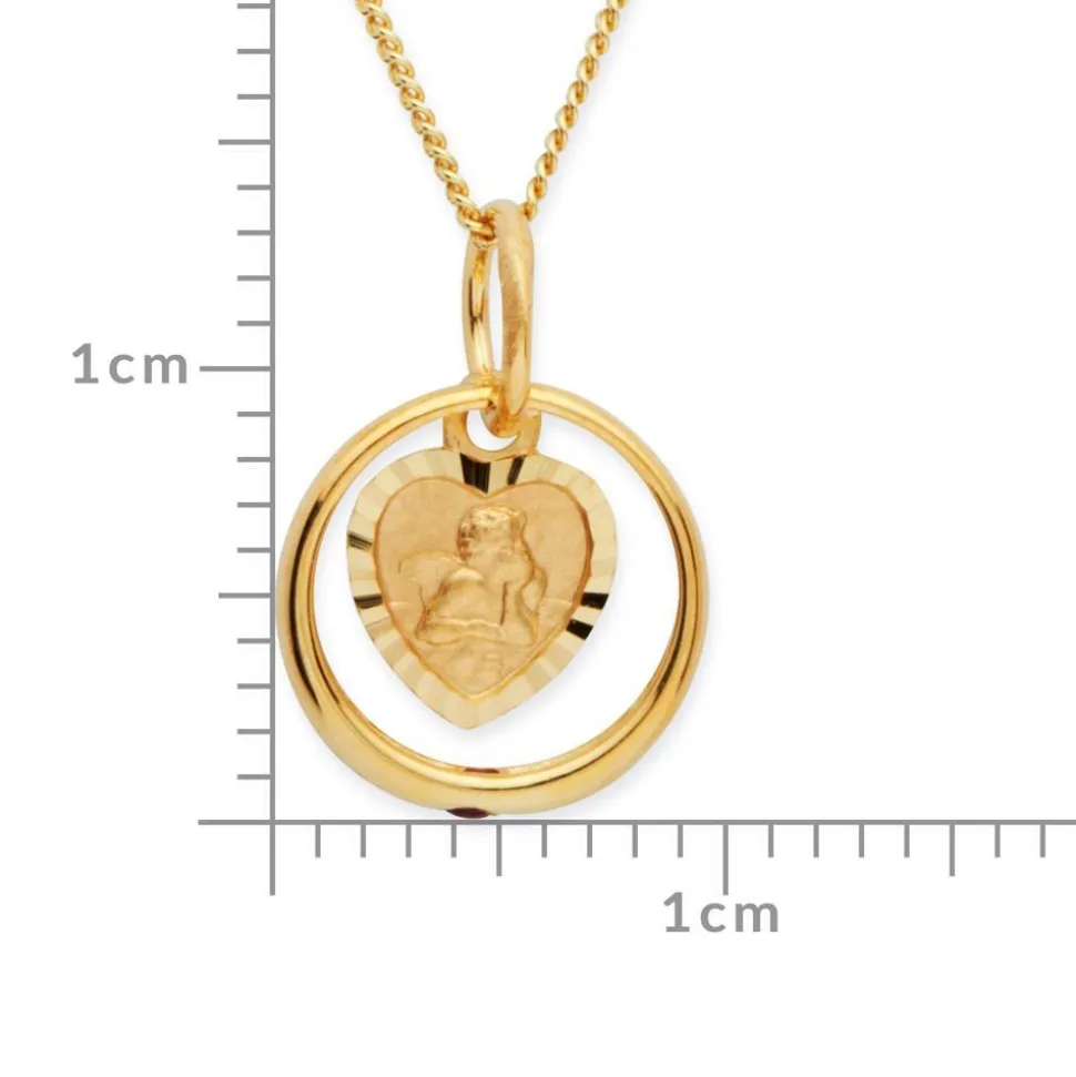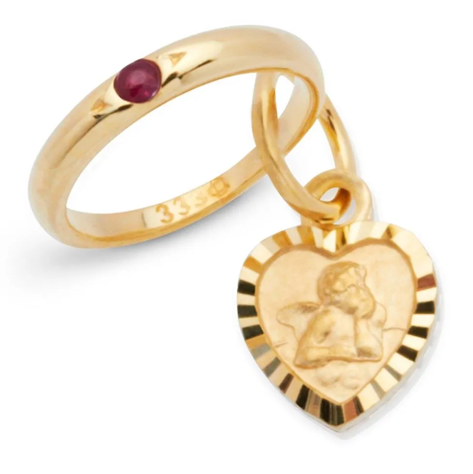 Der Blickfang dieser Kette aus 8-karätigem Gold ist der Taufring mit dem Engelsanhänger. Der polierte Ring ist mit einem funkelnden Rubin besetzt und hängt an der ovalen Öse des Anhängers. Der Anhänger in Herzform wird von einem geprägten Engelmotiv mit Strahlenkranz geziert.