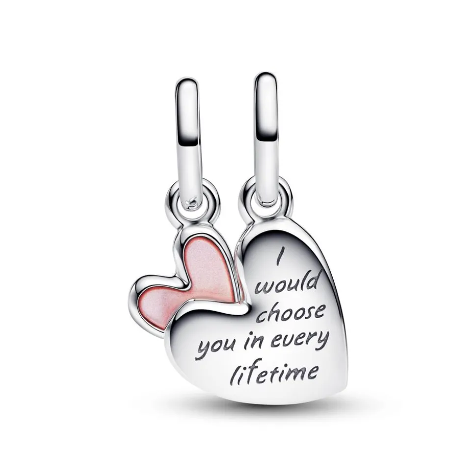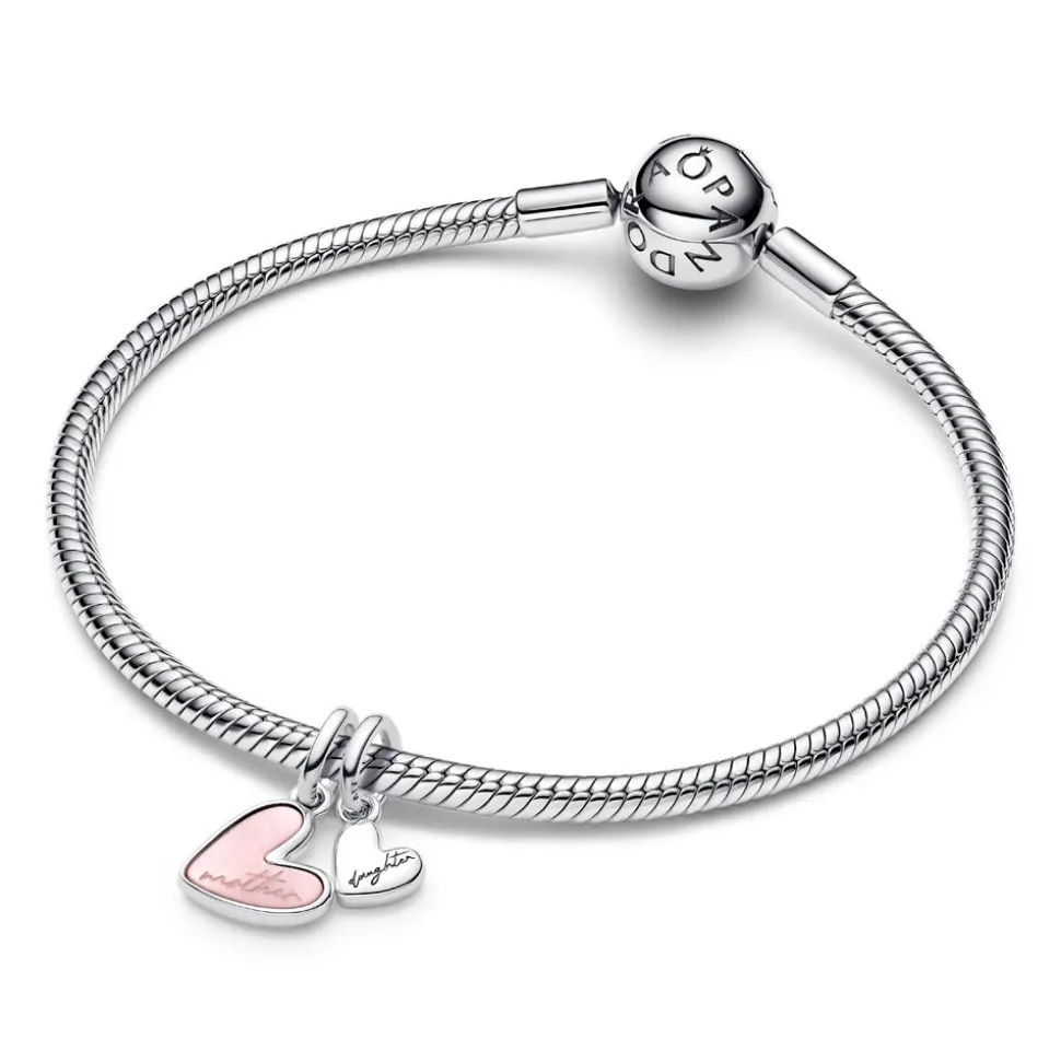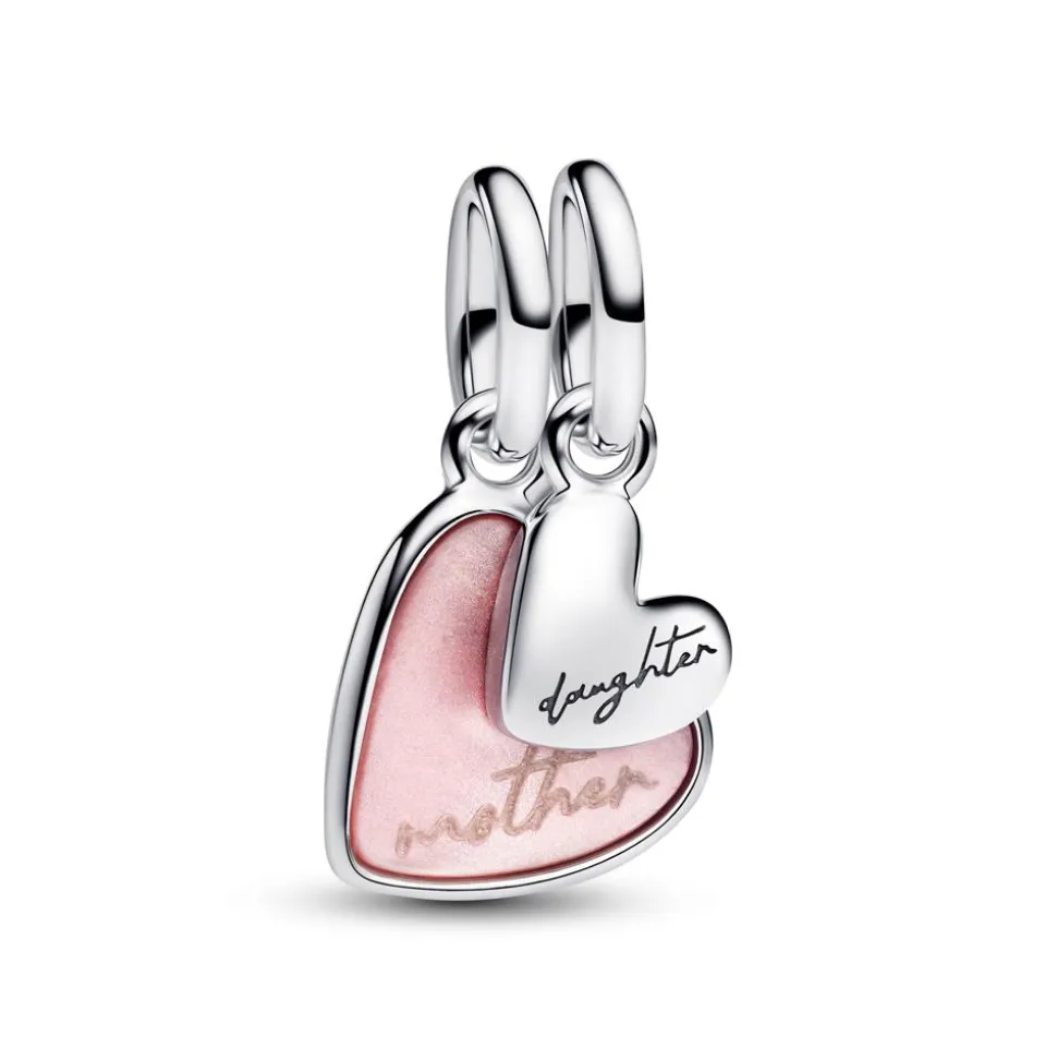Diese zwei Charm-Anhänger sind die perfekte Kombination. Sie bestehen beide aus recyceltem 925er Silber, besitzen eine Herzform und fassen auf der Vorderseite eine Platte aus rosafarbenem Perlmutt (synth.). Dabei trägt der größere Anhänger auf der Vorderseite die Gravur „mother“ und auf der Rückseite den Schriftzug „I would choose you in every lifetime“. Der kleinere weist dahingegen auf der Rückseite das Wort „daughter“ auf. Beide Anhänger sind mit der ME- und Moments-Kollektion kompatibel.