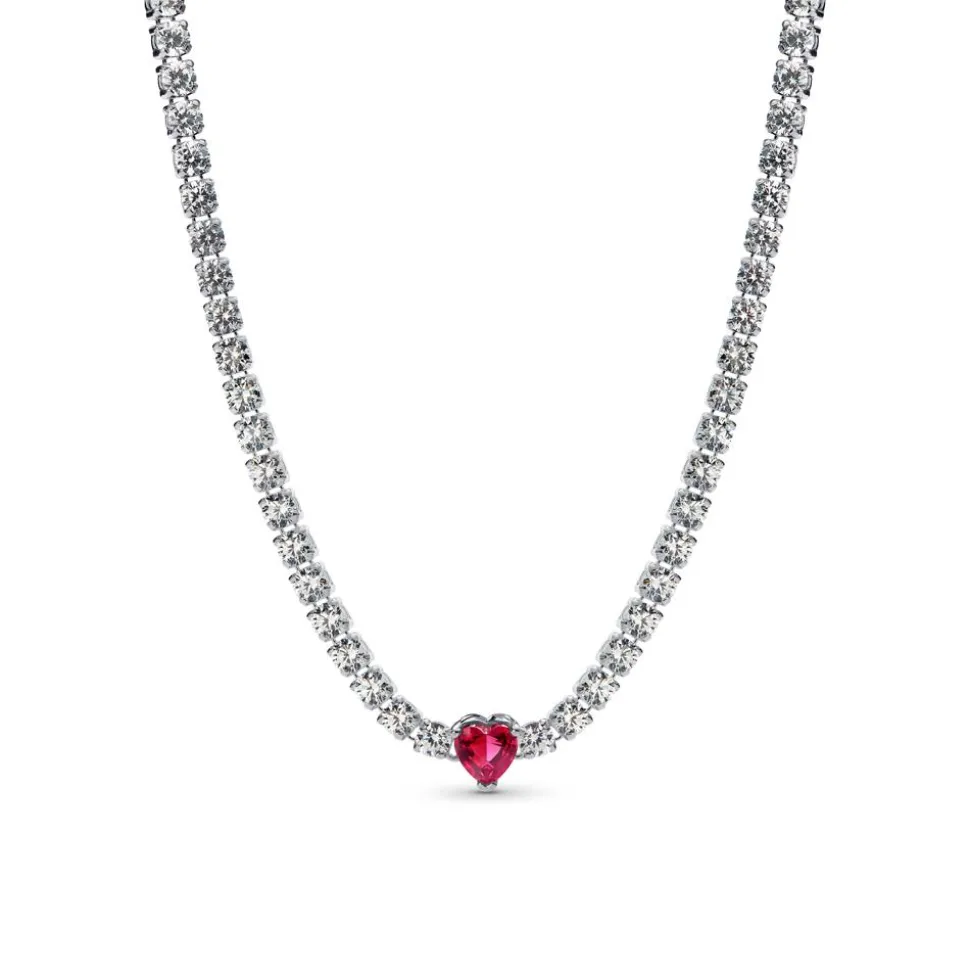 Diese Damenkette ist wunderschön. Sie ist aus recyceltem Sterlingsilber gefertigt und mit strahlenden Zirkoniasteinen besetzt. In die Mitte der Kette ist dabei ein roter Schmuckkristall in Herzform eingearbeitet, der für einen besonderen Blickfang sorgt. Neben dem Karabinerhaken verfügt die Kette über einen Zugverschluss, durch den die Länge reguliert werden kann.