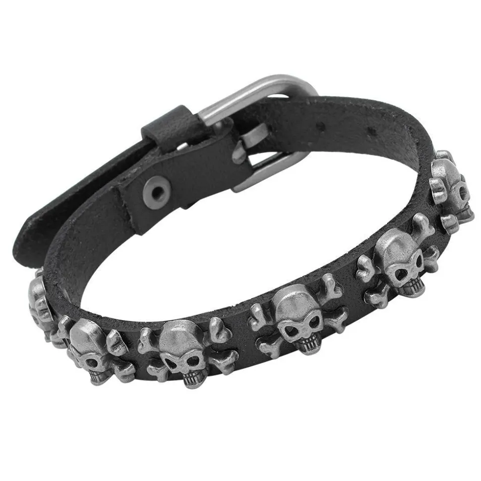 Rocker-Lederarmband im stylischen Totenkopf-Design. Das Armband ist längenverstellbar.