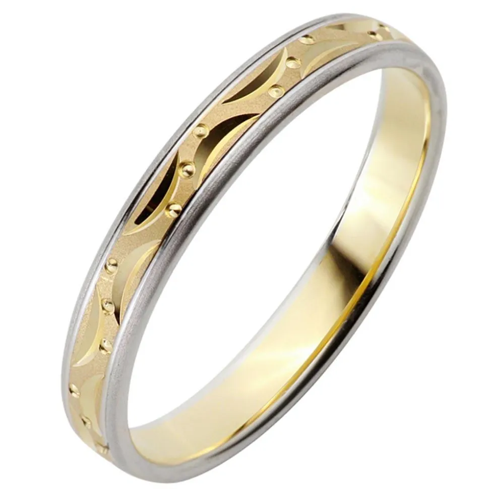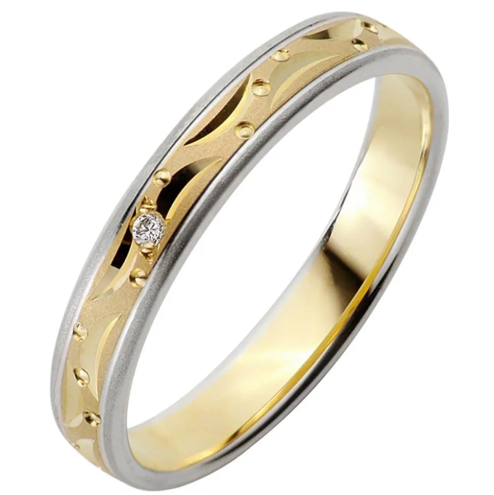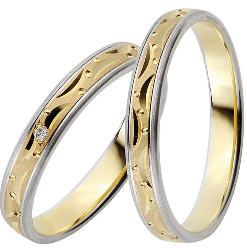Mit ihrer zauberhaften Oberflächengestaltund sorgen diese Trauringe für Begeisterung. Die sandmatten Ringe aus Gold werden von geschwungenen Einkerbungen und runden Vertiefungen geziert und besitzen Kanten aus Weißgold. Als zusätzlicher Blickfang dient der ca. 0,01 ct. große Diamant auf dem Damenring. Er verfügt über einen Brillantschliff und zeichnet sich durch die Reinheit „small inclusions“ und die Farbe „Wesselton“ aus. Zudem ist er konfliktfrei. Die innenseitige Bombierung (Abrundung) der Ringe ermöglicht ein äußerst angenehmes Tragen. Gerne fügt unser professionelles Team von Graveuren eine individuelle Gravur hinzu.
