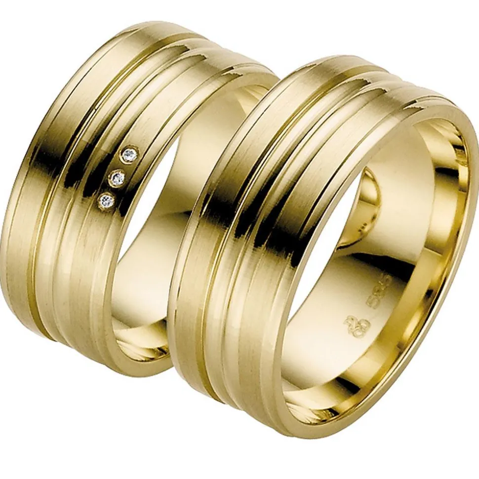 Diese Trauringe sind aus Gold gefertigt und stammen aus der Kollektion „Elements 2“ von Rauschmayer. Ihre feinmatten Ringschienen stechen besonders durch die zahlreichen breiten Glanzrillen hervor, die den Ringen ein modernes Aussehen verleihen. Der Damenring wird zudem von 3 Brillanten geziert (insgesamt ca. 0,03 ct., Farbe: Wesselton, Reinheit: small inclusions, konfliktfreier Ursprung). Durch die innere Abrundung besitzen die Ringe ein komfortables Tragegefühl. Auf Wunsch kann eine persönliche Gravur hinzugefügt werden.