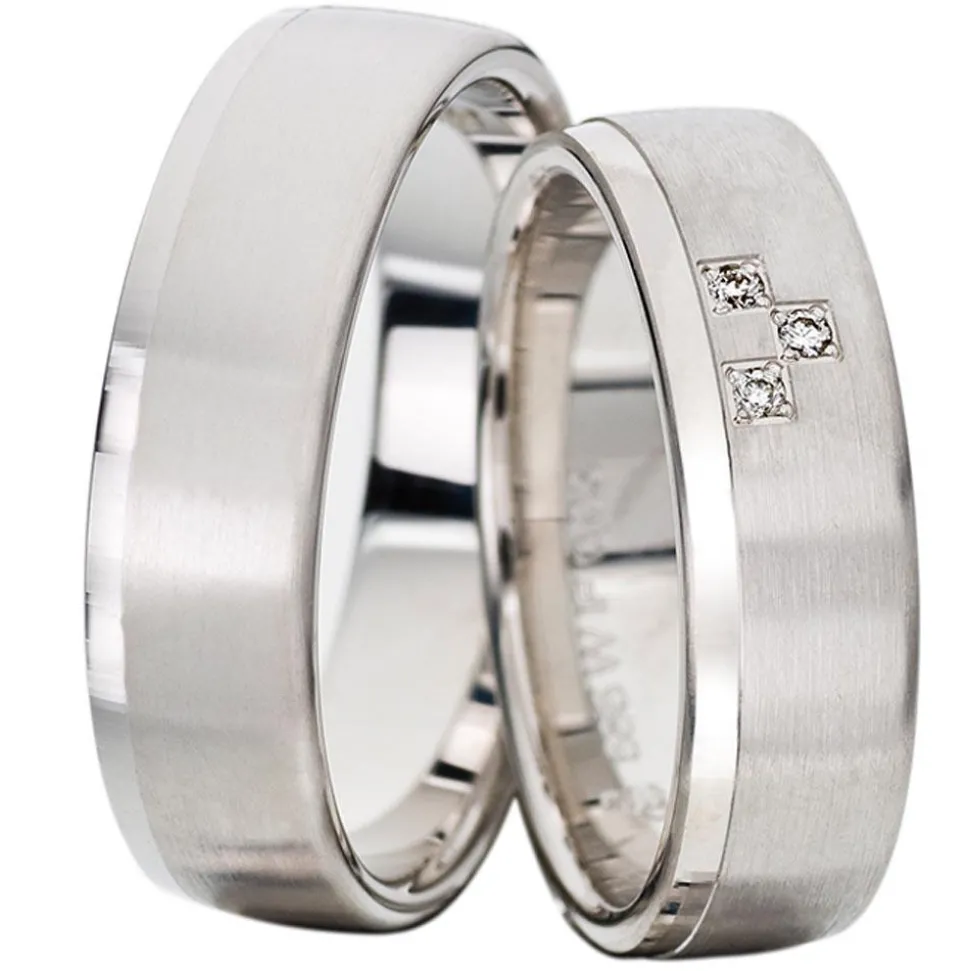 Ein besonders stilvolles Design zeichnet diese Trauringe aus Weißgold aus. Ihre Ringschienen besitzen eine Längsmattierung und werden von einer polierten Außenkante perfekt ergänzt. Auf dem Damenring befinden sich noch 3 Brillanten mit insgesamt ca. 0,03 ct. Die Diamanten haben eine dreieckige Anordnung und besitzen eine hohe Qualität (Farbe: Top Wesselton, Reinheit: small inclusions, konfliktfreier Ursprung). Für einen idealen Tragekomfort sorgt die innere Abrundung der Ringe. Zudem kann auf ihrer Innenseite eine persönliche Botschaft graviert werden.