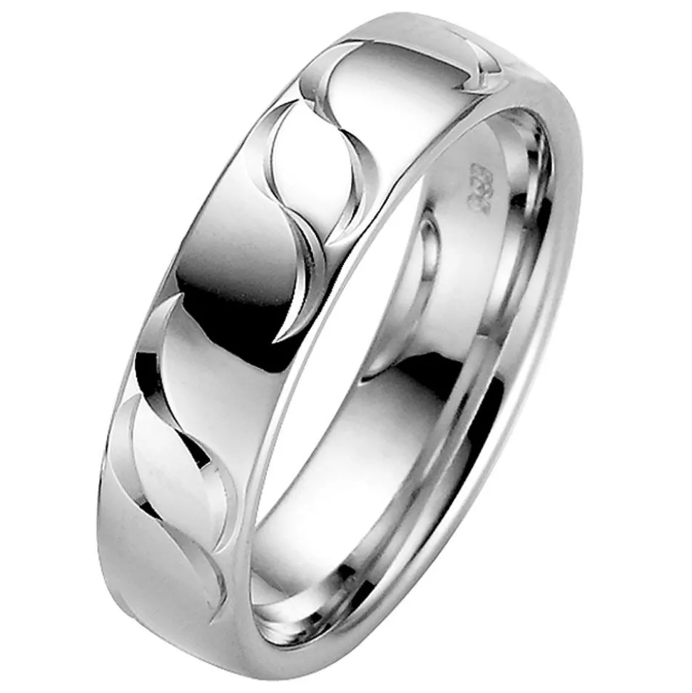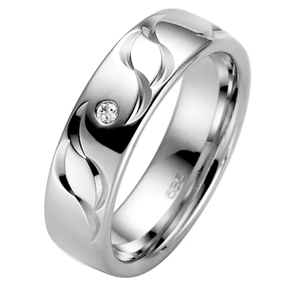 Ansprechend schön – das sind diese Trauringe aus der Kollektion „Elements 2“ von Rauschmayer. Die Ringe sind aus Weißgold gefertigt und besitzen eine polierte Oberfläche, die von geschwungenen Einkerbungen geziert wird. Der Damenring ist mit einem Brillanten besetzt (ca. 0,03 ct., Farbe: Top Wesselton, Reinheit: small inclusions, konfliktfreier Ursprung). Dank der inneren Abrundung sind die Ringe angenehm zu tragen. Ihre Innenseite kann mit einer Wunschgravur versehen werden.
