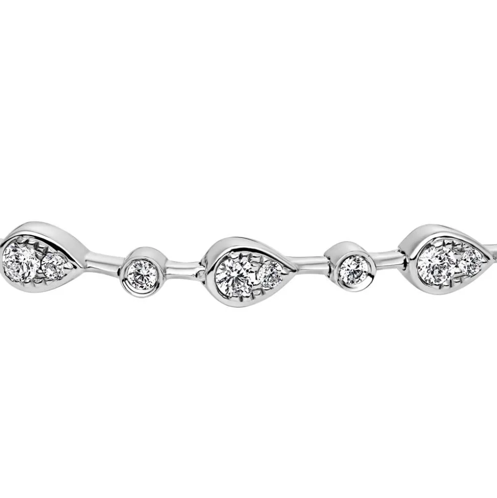Dieses Damenarmband ist ein traumhafter Blickfang. Es ist in Weißgold (585er oder 750er) oder Platin (950er) erhältlich und besteht aus tropfenförmigen Schmuckelementen, die sich mit zargengefassten Diamanten abwechseln. Über das Drop-down-Feld kann die bevorzugte Legierung ausgewählt werden. Die tropfenförmigen Zierelemente sind mit jeweils einem großen und einem kleinen Diamanten besetzt. Insgesamt besitzt das Armband 42 brillantgeschliffene Diamanten mit ca. 1,34 ct. (gesamt). Die Farbe der Brillanten ist als „Feines Weiß“ (Top Wesselton) klassifiziert und ihre Reinheit gehört zur Kategorie „small inclusions“. Selbstverständlich besitzen alle Diamanten eine konfliktfreie Herkunft, da wir auch auf ethische Aspekte großen Wert legen. Dank des Clipverschlusses und dem Sicherheitsbügel sitzt das Armband sicher am Handgelenk.