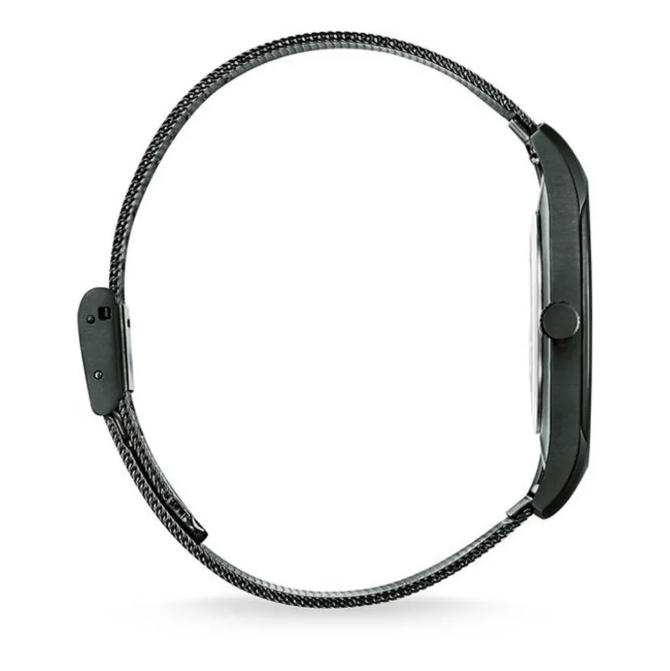 Wirkungsvoll modern – das ist diese Armbanduhr für Damen und Herren. Das Milanaiseband aus schwarzbeschichtetem Edelstahl hält das ebenfalls schwarze Uhrengehäuse, in welchem das zuverlässige Quarzwerk sitzt. Auf dem schwarzen Zifferblatt befindet sich eine praktische Datumsanzeige. Die Uhr wird mit einer Faltschließe geschlossen und das Uhrengehäuse ist bis zu einem Druck von 3 bar wasserdicht.