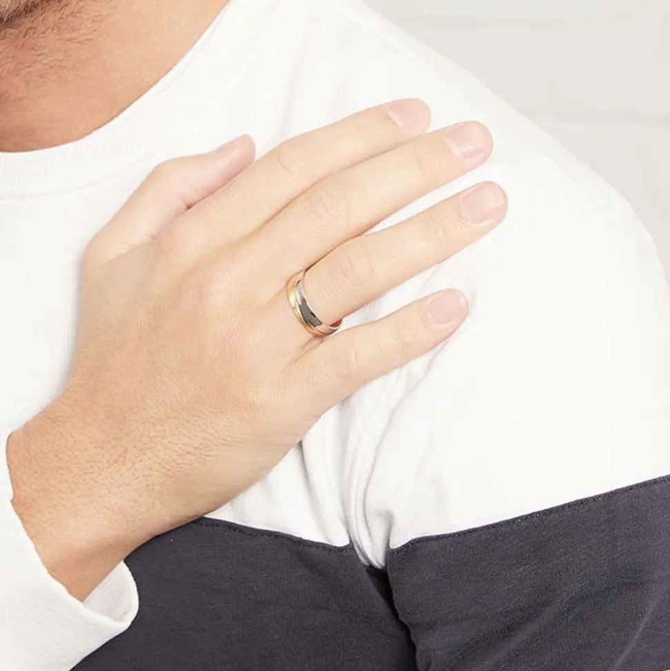 Hochwertiger Ring aus echtem 925er Sterlingsilber von Vivo. Der Ring besitzt eine teilvergoldete sowie rhodinierte Oberfläche, diese werden von einer geschwungenen Glanzrille getrennt. Der Ring lässt sich dank seiner Bombierung (=Innenseite abgerundet) besonders angenehm tragen. Zudem besteht ein Korrosionsschutz dank seiner Rhodinierung. Sie können den Ring auf Wunsch mit einer Innengravur versehen lassen.