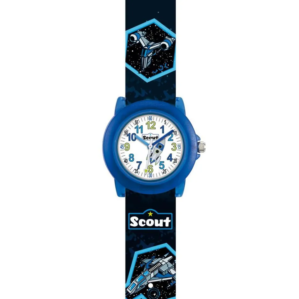 Ein besonderer Begleiter für kleine Weltraumentdecker – das ist diese Armbanduhr. Mit einem quarzangetriebenen Uhrwerk ausgestattet sorgt die Uhr für eine präzise Zeitangabe. Das blaue Gehäuse der Uhr besteht aus thermoplastischem Polycarbonat, welcher besonders hitzebeständig und schlagfest ist. Zudem ist sie dank der Weltraum-Motive auf dem schwarzen Kunstlederarmband auch noch ein echter Hingucker! Neben einem Astronauten, sind darauf auch verschiedene Raumschiffe zu erkennen. Auf dem weißen Zifferblatt befindet sich eine Raumkapsel, drei Zeiger sowie gut lesbare Zahlen. Das längenverstellbare Armband wird mit einer Dornschließe geschlossen. 5 ATM.