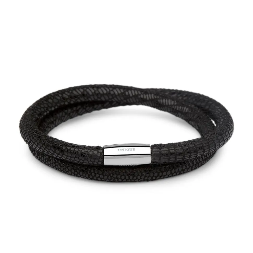 Der schwarze, an das Muster der in Indien als Gottheit verehrten Königskobra erinnernde Bezug dieses Lederarmbandes sieht an jedem Handgelenk hervorragend aus. Falls dies noch nicht genügt, kann das Armband mit Clip-Charms weiter aufgerüstet werden. Lassen Sie sich von der vortrefflichen Verarbeitung, dem ausgezeichneten Material und dem griffigen Magnetverschluss dieses zweireihigen Lederarmbandes überzeugen!