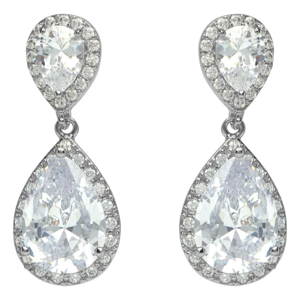 Für den großen Auftritt eignen sich diese Modeschmuck-Ohrringe. Ein kleineres tropfenförmiges Element ist durch Ösen mit einem größeren tropfenförmigen Element verbunden. Beide Elemente sind vollkommen mit facettierten Schmucksteinen besetzt, die ein aufsehenerregendes Funkeln hervorrufen.